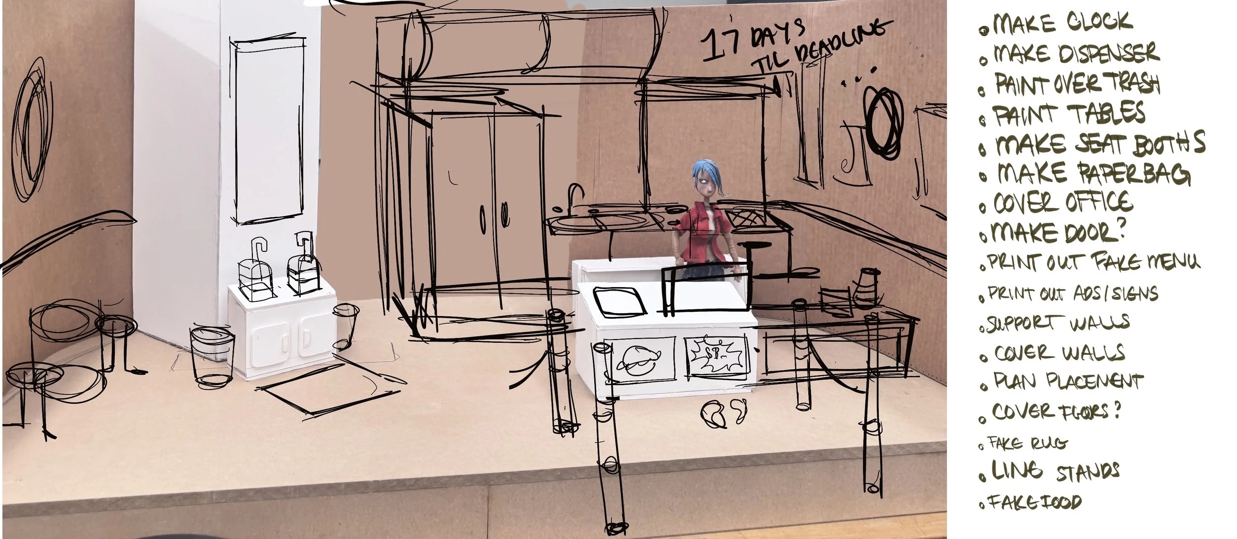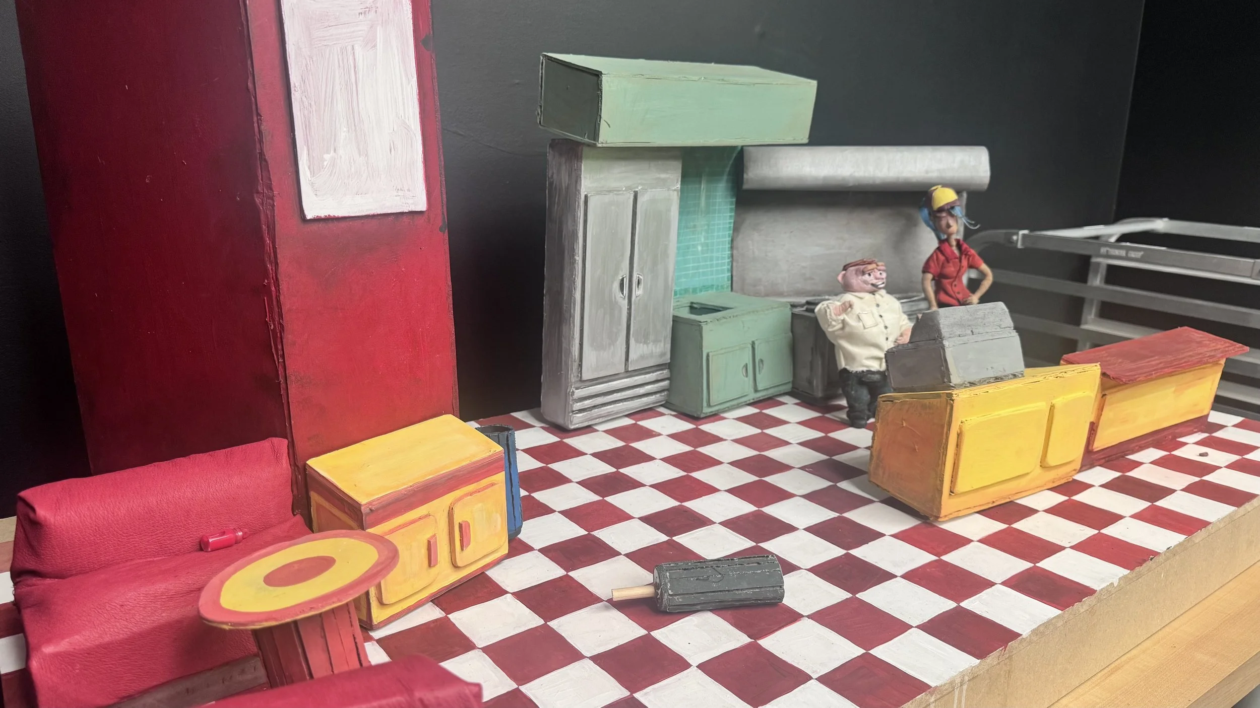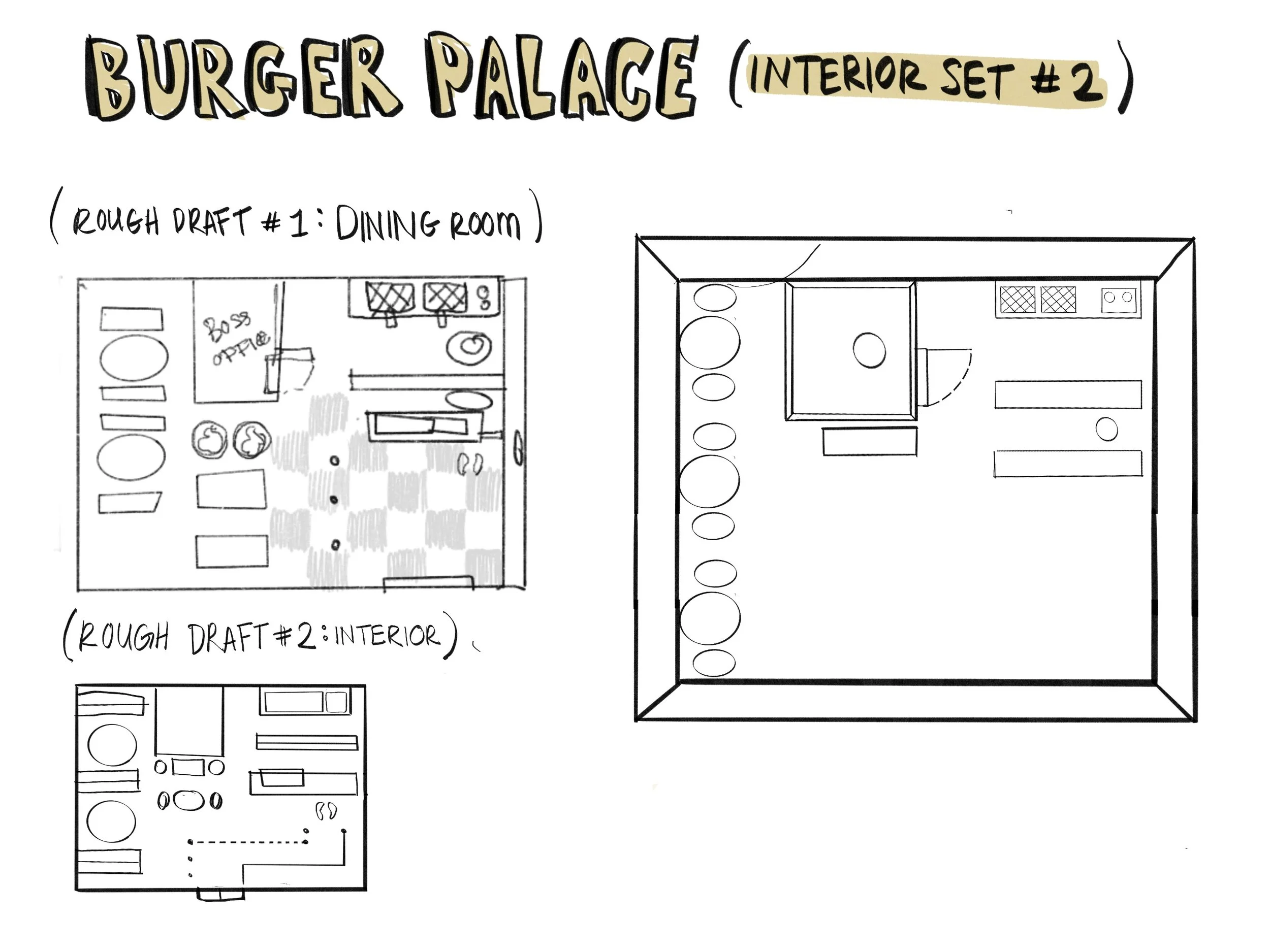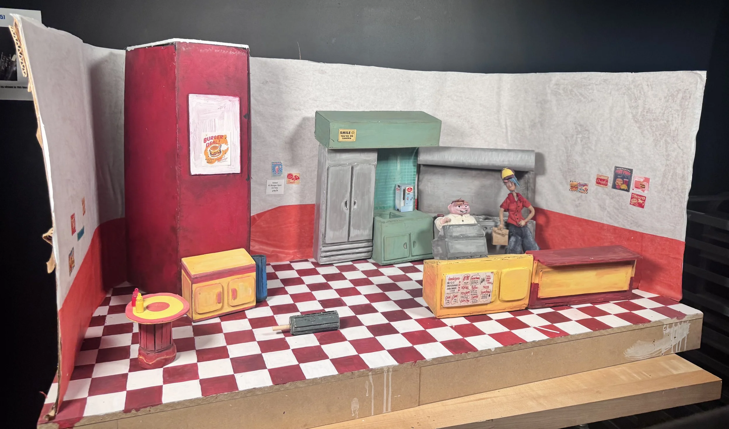 In addition to the exterior set I got to make the interior set of the burger place. With help from Camila Montero, who assisted in painting the interior set props.